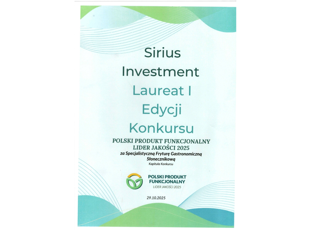 Z dumą informujemy, że nasza specjalistyczna frytura słonecznikowa została wyróżniona tytułem „Polski Produkt Funkc...